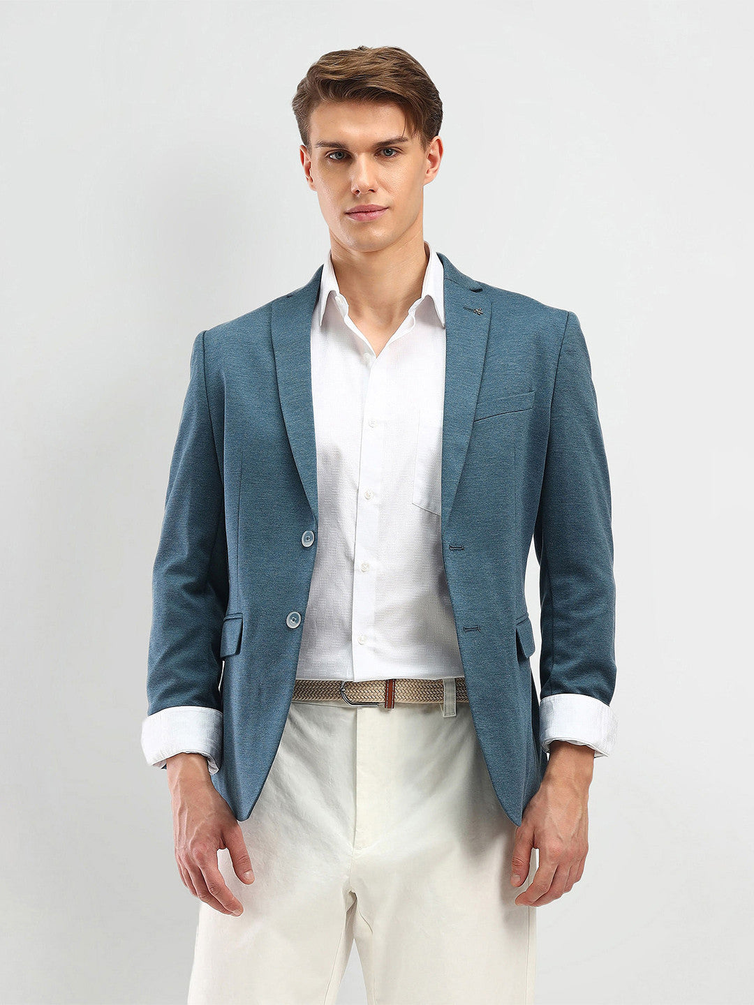 This slim-fit blazer features a refined notched lapel collar accented with a subtle brand pin, enhancing its sleek, professional appearance. Designed with a single-breasted front and double-button closure, it offers a clean silhouette suitable for formal occasions. The long sleeves end in buttoned cuffs for added sophistication, while three functional pockets provide convenient storage. Crafted from a durable twill weave fabric blend of polyester, rayon, and spandex, it balances comfort with structure. The double-vented back ensures ease of movement, and the textured self-design pattern adds depth to the blazer. Dry clean recommended to maintain its sharp look. The model, standing 6 feet tall, wears a size 36 for reference.