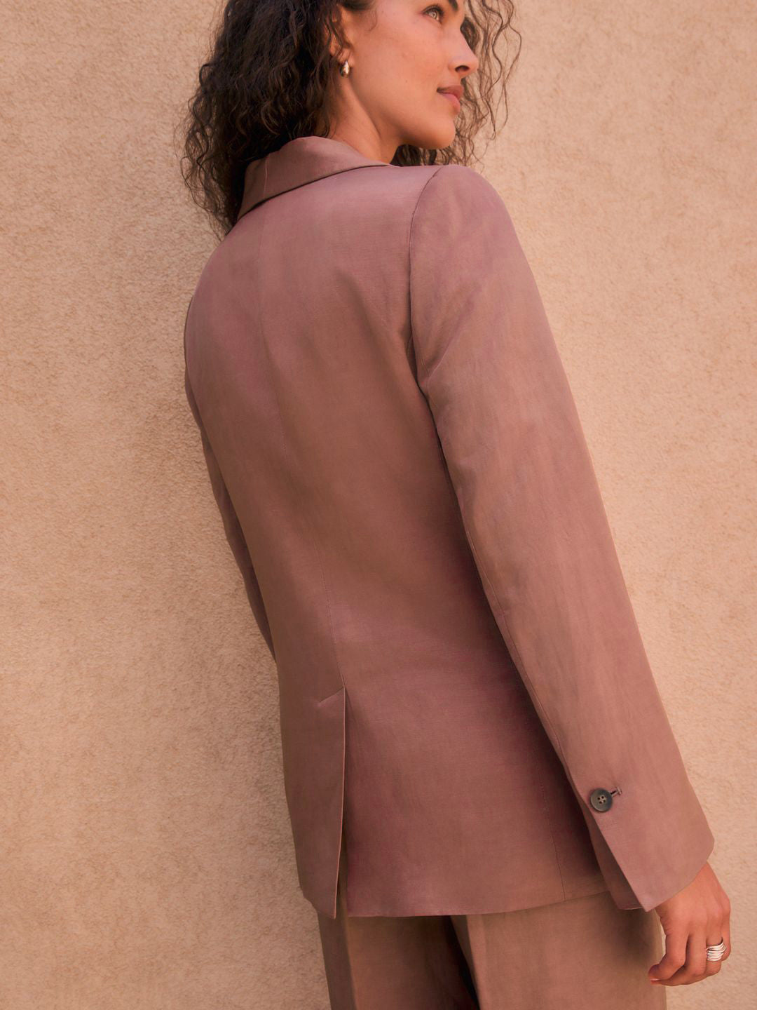 This mauve single-breasted blazer features a refined shawl collar and long regular sleeves, crafted from a blend of 64% viscose and 36% linen for balanced comfort and breathability. The interior is lined with a smooth polyviscose fabric, enhancing durability and ease of wear. Designed with two flap pockets and an additional inner pocket, it offers practical storage without compromising style. The regular fit and single vented hem provide a tailored look suitable for casual occasions. Finished with button closure and ready-to-wear stitching, this blazer combines quality materials and expert tailoring for a polished, sophisticated appearance. Dry clean only for best care.