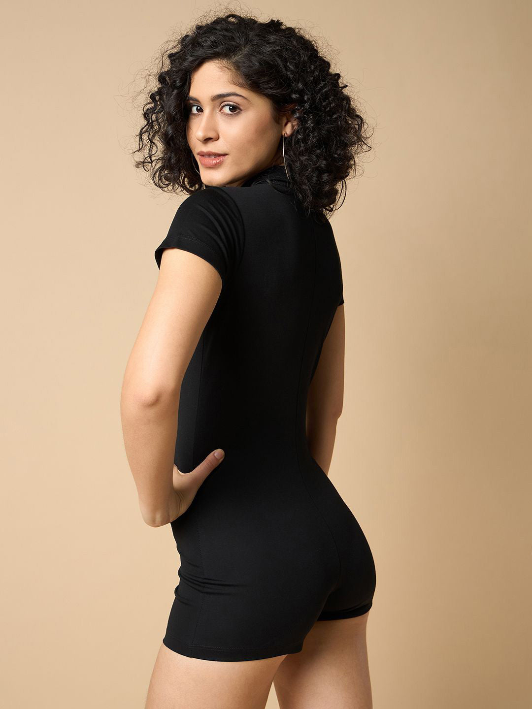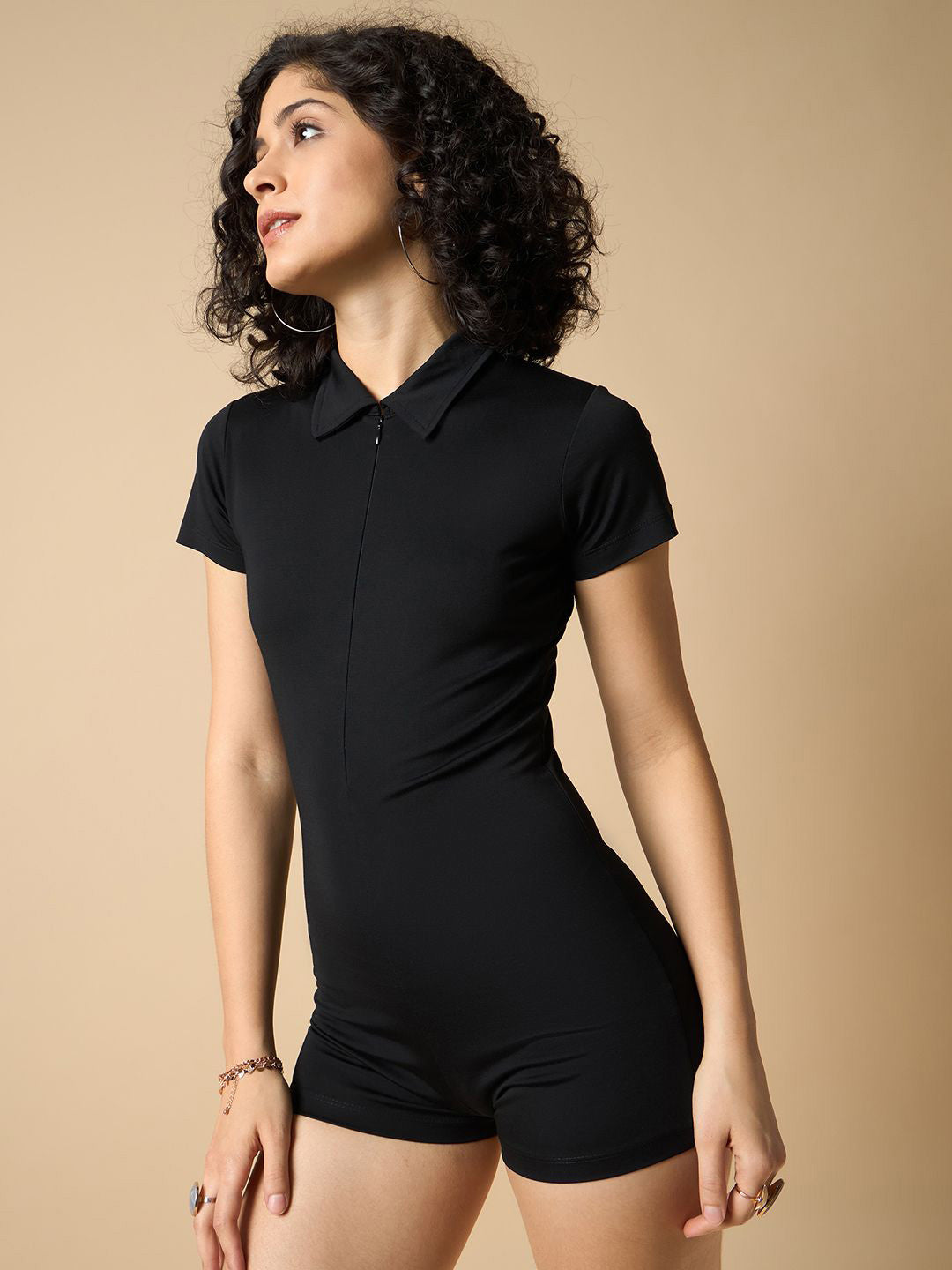 This black solid playsuit features a shirt collar and short sleeves, designed for casual wear. Crafted from nylon, it includes a zip closure for ease of use. The garment is machine washable, ensuring easy care. The model, standing 5'8", is shown wearing a size S. This piece offers a sleek, versatile option with a clean, solid pattern and comfortable fit.
