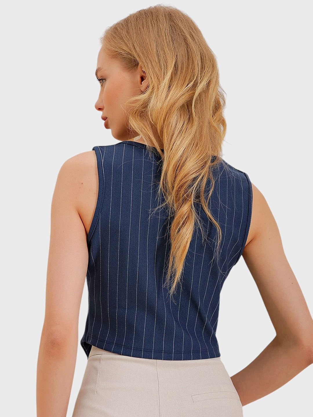 Elevate your wardrobe with this navy-blue striped corduroy waistcoat, expertly crafted to combine style and comfort. Featuring a classic V-neck and sleeveless design, it offers a sleek silhouette ideal for layering over shirts or lightweight sweaters. The full buttoned placket ensures a secure fit, while two thoughtfully placed pockets add practical functionality without compromising elegance. Made from a durable blend of 50% polyester, 40% cotton, and 10% lycra, this waistcoat provides a subtle stretch for enhanced mobility and comfort throughout the day. Its corduroy weave adds textural interest and warmth, making it a versatile piece suitable for both casual and semi-formal occasions. To maintain its refined appearance, professional dry cleaning is recommended. Available in size S, modeled at 5'8", this waistcoat delivers a tailored fit that complements a variety of body types.