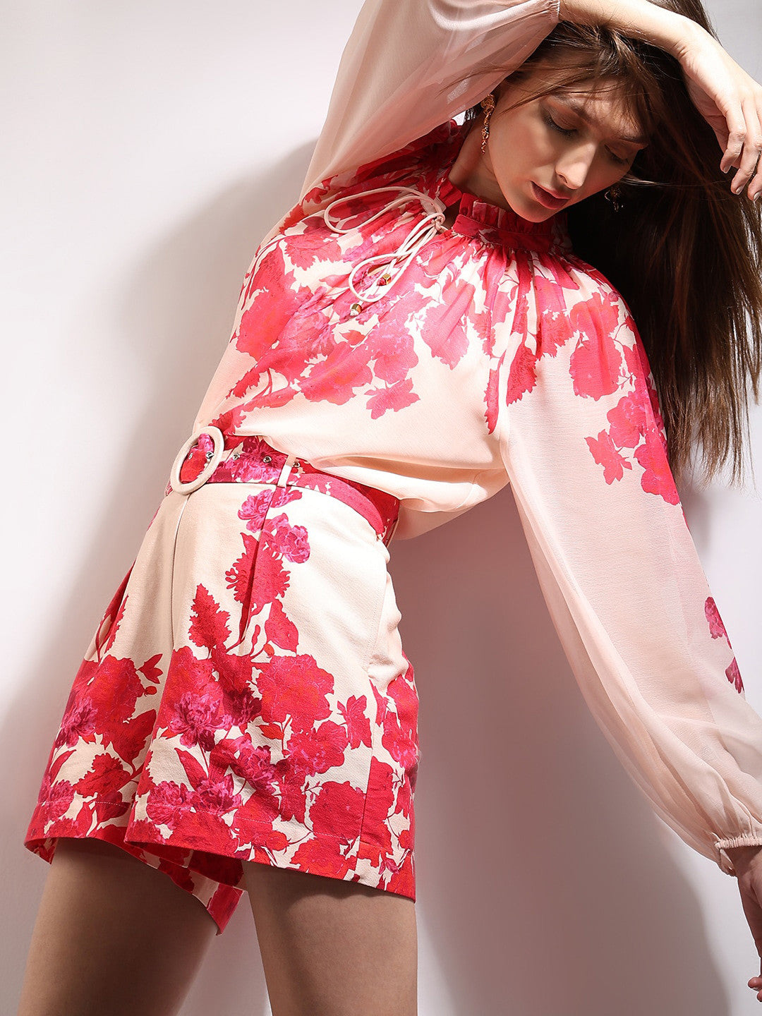 Product Details: Beige shorts featuring a pink floral print with a high-rise waist and regular fit, equipped with two pockets and a button closure. Includes a matching belt. Size & Fit: Designed for a regular fit; model with a height of 5'8" is shown wearing size 28. Material & Care: Made from 100% cotton; machine washable. Specifications: High-rise waist, above-knee length, regular fit silhouette, two pockets, woven fabric, and package contains one pair of shorts and one belt.